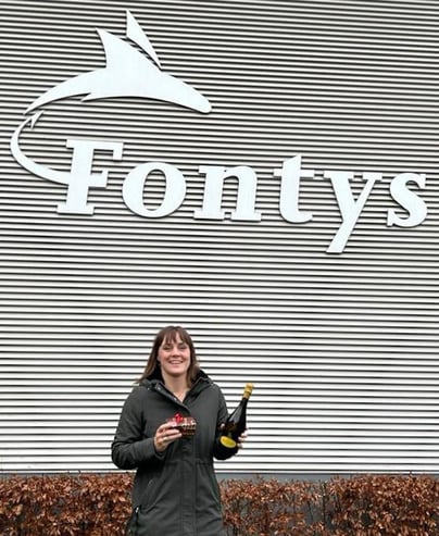Ik rij naar Eindhoven en bedenk me dat dit nog maar 3x hoeft. Het gesprek en nog 2 lessen. Hoe fijn!! Ik zie Peter van Binsbergen op de campus, als studie-coach is hij uiteraard ook aanwezig bij het gesprek. Sebastiaan legt uit dat het gesprek is met mij, en dat Peter als back-up aanwezig is als ik het even niet meer weet. Het gesprek loopt soepel voor mijn gevoel, wat vragen over groepsdynamiek, culturele verschillen in de klas, wat ik geleerd heb en waar ik over 5 jaar zou willen zijn. Dingen die ik gewoon zo kan vertellen. Sebastiaan sluit het gesprek af en ik kan koffie gaan drinken en ook Peter en Sebastiaan praten nog even. Samen komen ze mij halen en lopen we terug. Sebastiaan is direct duidelijk, ik heb mijn opleiding behaald. Geen onvoldoende of voldoende, geen cijfer. Gewoon behaald. Hoe tof!! Peter overhandigd mij een fles prosecco en wat lekkers. Een gek moment, want nu is het klaar. Minder opluchting dan ik dacht, maar die was er eigenlijk afgelopen maandag al. We nemen afscheid van Sebastiaan en maken nog foto’s bij het Fontys logo.