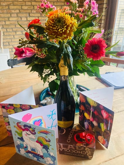Direct na de slagboom zet ik mijn auto met knipperlichten aan de kant en ga naar de site van Nagoya sushi in Ulvenhout. Even de menukaart bekijken, bellen om de bestelling door te geven en dan richting huis. Via Nagoya sushi kom ik thuis aan, auto parkeren, schoenen uit, jas uit… ik loop de woonkamer in en zie direct een grote bos bloemen staan, twee plantjes en 3 kaarten. Ik ben direct emotioneel, en de tranen komen direct. Al die maanden werken aan een opleiding, ‘die nu eenmaal nodig is’, maar die absoluut ontzettend persoonlijk is geworden. Nu is het nu echt klaar. Ik knuffel de kids. Lieve teksten op de kaarten helpen niet mee aan het tegenhouden van de tranen, maar dat maakt ook niet uit, en ik besef me maar weer eens: wat heb ik toch een fijn gezin en wat wonen we hier heerlijk!